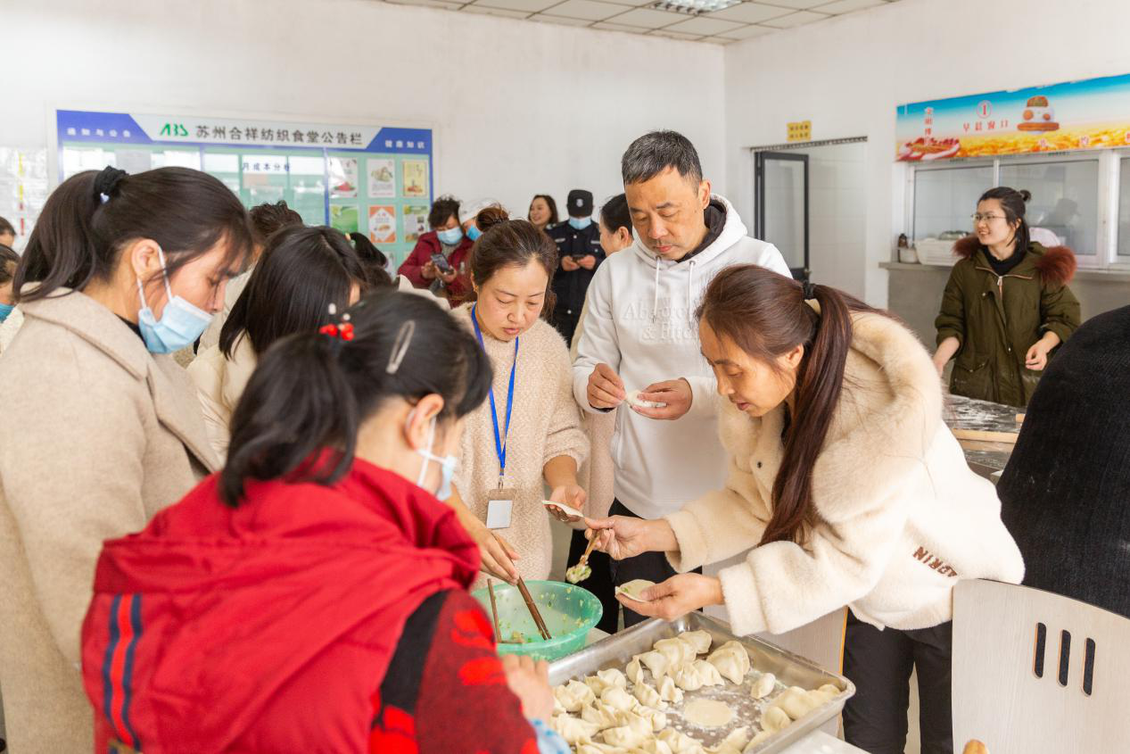 据悉,合祥纺织工厂共计400多名外地员工,春节期间已有超50%的员工选择留厂过年,有效帮助降低春节返乡带来的疫情传播风险,保障节后复工安全。 新年联欢晚会——欢乐包饺团圆 2月10日,腊月二十九,为感谢合祥员工为疫情防控做出的牺牲和贡献,让“就地过年也是年,喜悦同行过好年”的思想深入人心,地平线控股集团携手相城区阳澄湖镇总工会举办了一场热闹非凡的“合祥新春联欢会”。 包饺子,迎新春;唱欢歌,庆牛年;跳热舞,共祈福。丰富多彩的文娱节目,有趣好玩的互动游戏接连上演,歌声、笑声、欢呼声此起彼伏,联欢会现场处处洋溢着合祥大家庭的融融亲情和豪情壮志,台上台下互动成欢乐的海洋。 喜庆的节目、温情的话语、贴心的礼物......让每位留相过年的员工都感受到了家的温暖和浓浓的年味,就地过年,依旧年味不减。